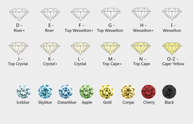 Doch es gibt auch ausgefallenere Diamantfarben. Diamanten in Blau (Iceblue, Skyblue, Oceanblue), Grün (Apple), Gold, Conjac, Rot (Cherry) oder Schwarz (Black) gehören zu den beliebtesten Farben.