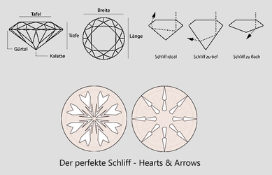 Der „Cut“ beschreibt die Art des Schliffs. Von ihm hängt das „Feuer“ des Diamanten ab. Hierbei können exellent geschliffene Brillianten den Anschein erwecken „Funken“ zu versprühen. Hierbei bietet Brillianten ab einer Steingröße von 0,3 ct. denn so genannte „Hearts & Arrows“ Schliff. Dieser ist ein besonderes Qualitätsmerkmal, was nur dann vorkommt wenn Politur, Symmetrie und Schliff exellent sind. Schaut man hierbei von oben auf den Diamanten erkennt man deutlich Herzen, die sich symmetrisch um die Mitte herum verteilen. Schaut man von unten auf den Brillianten kommen Pfeile zum Vorschein. Bei einem exellent geschliffenen Diamanten sind alle 57 Facetten so geschliffen das 9 Kriterien exakt passend zueinander sind.