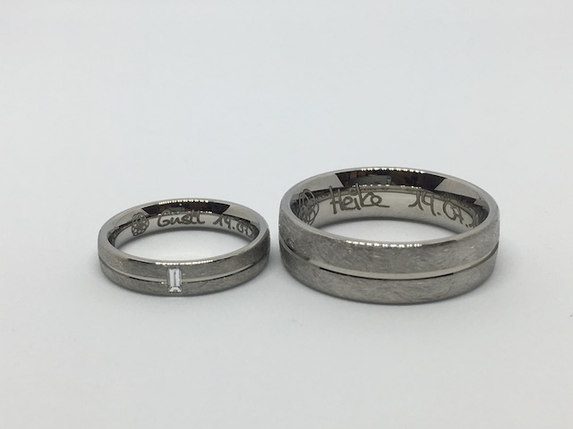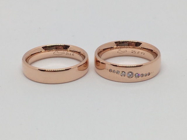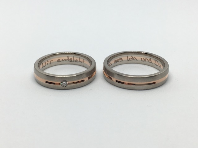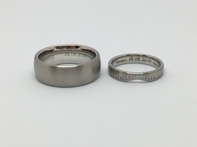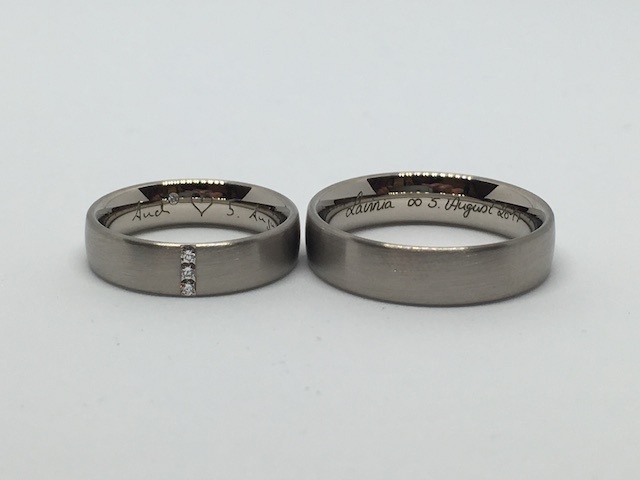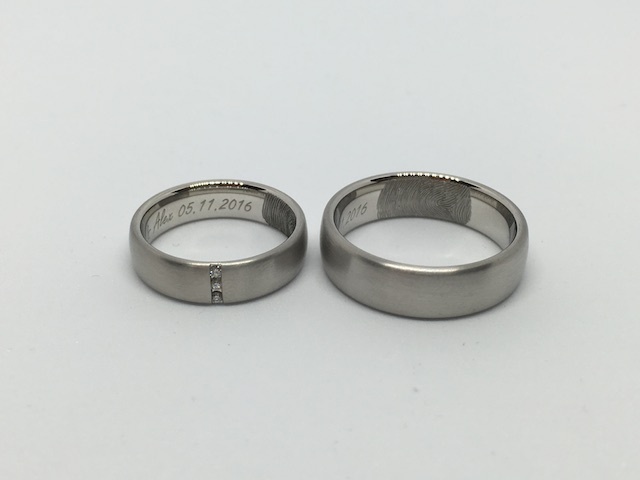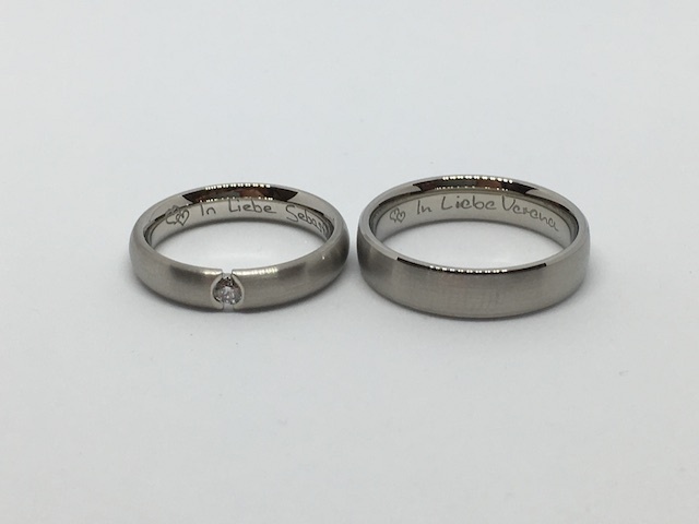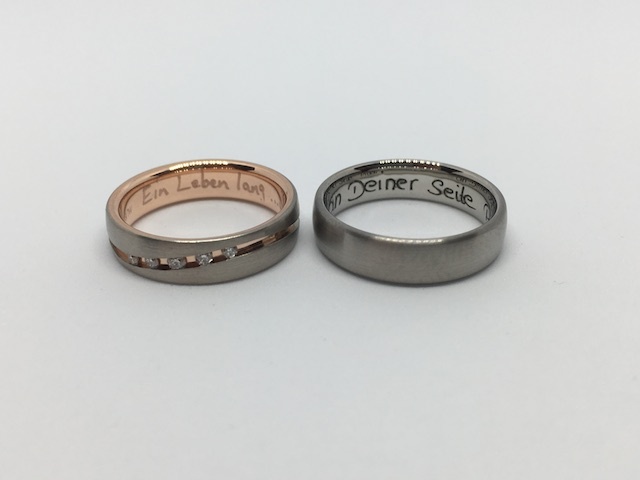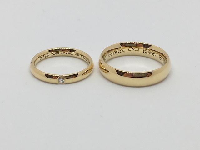 Oft entspricht es den Wünschen unserer Kunden, die eigenen Namen, verbunden mit dem Datum des Kennenlernens, der Verlobung oder der Hochzeit eingravieren zu lassen.