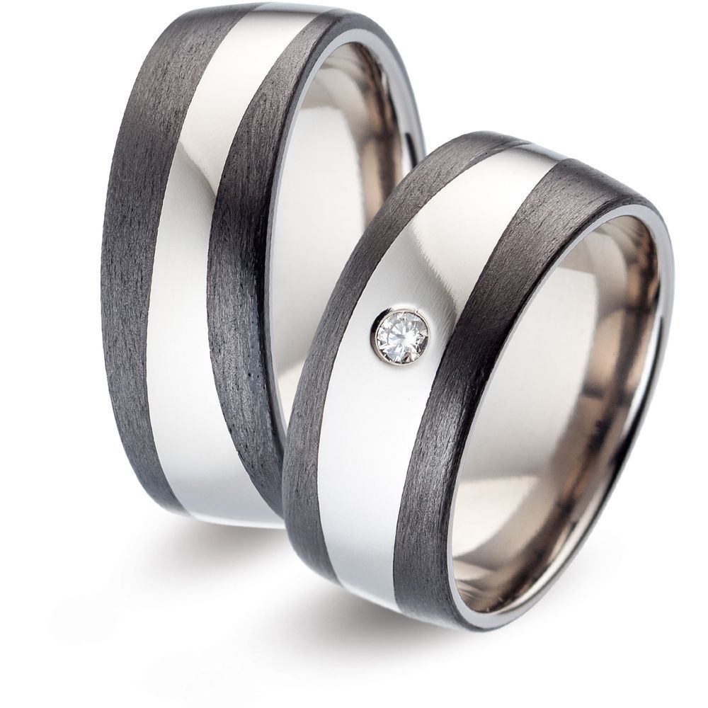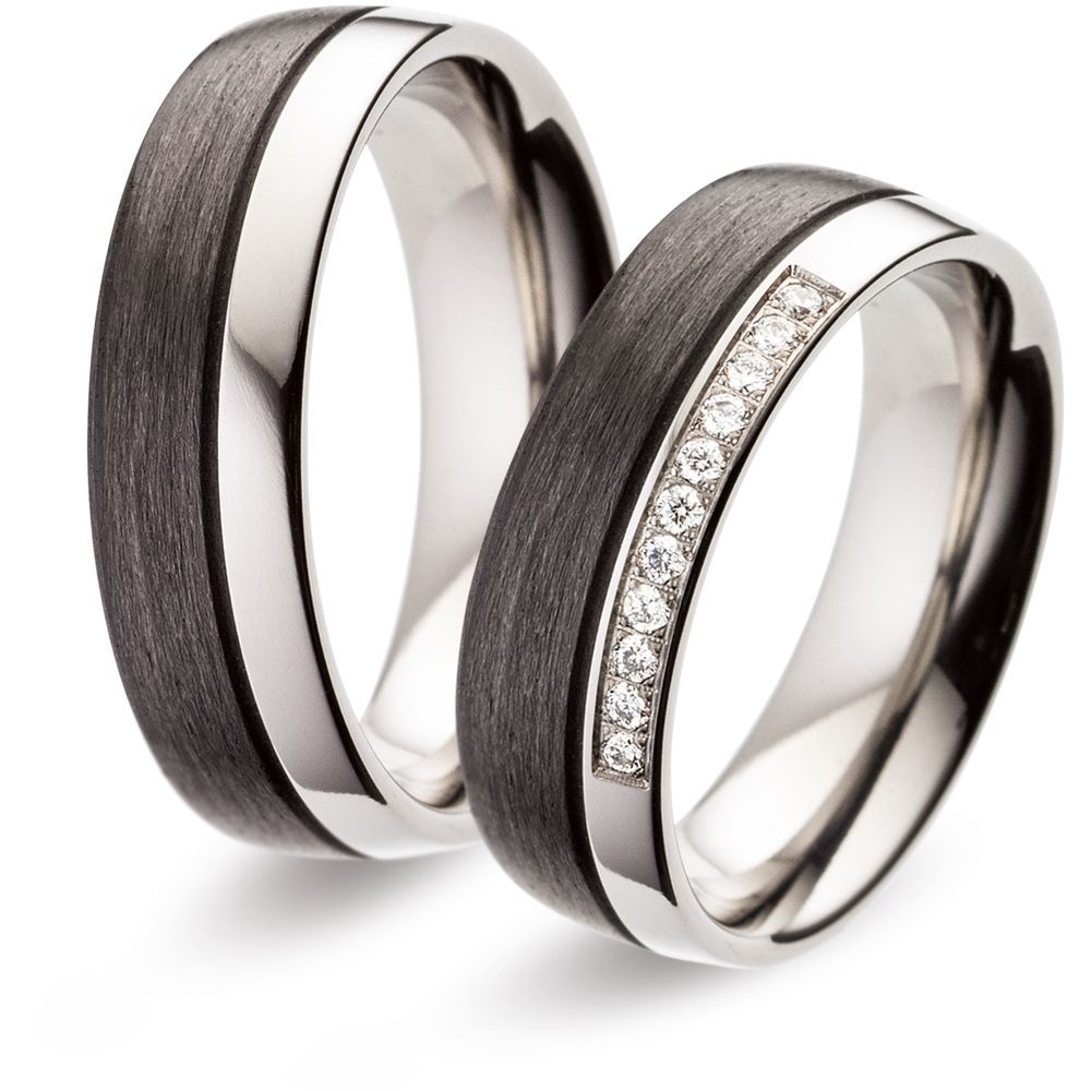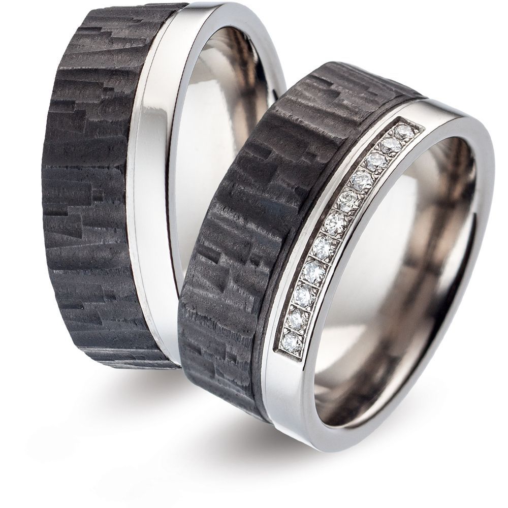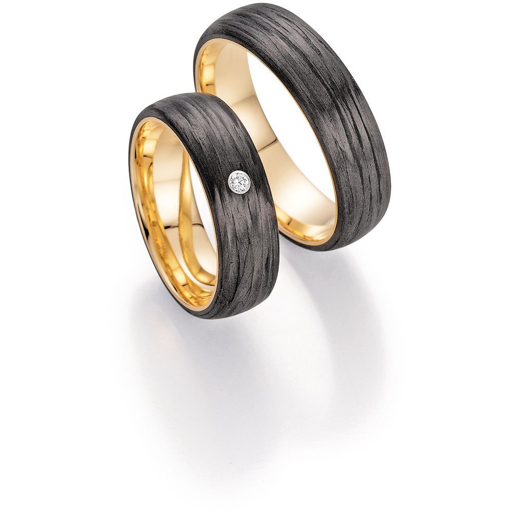 Carbon als Hightechwerkstoff begeistert durch seine absolute Stabilität und Beständigkeit gegen Chemikalien und Temperaturschwankungen. Zusätzlich gibt es beim Tragen kaum Abnutzungserscheinungen und die mit Carbon gefertigten Trauringe sind je nach Modell leichter als Ringe, die komplett aus einem Edelmetall gefertigt sind. Kombiniert mit farblich abgestimmten Legierungen wie Roségold, Rotgold, Palladium oder Platin und wunderschön strahlenden Brillanten, bezaubern die Modelle die Paare, die besondere Trauringe möchten.