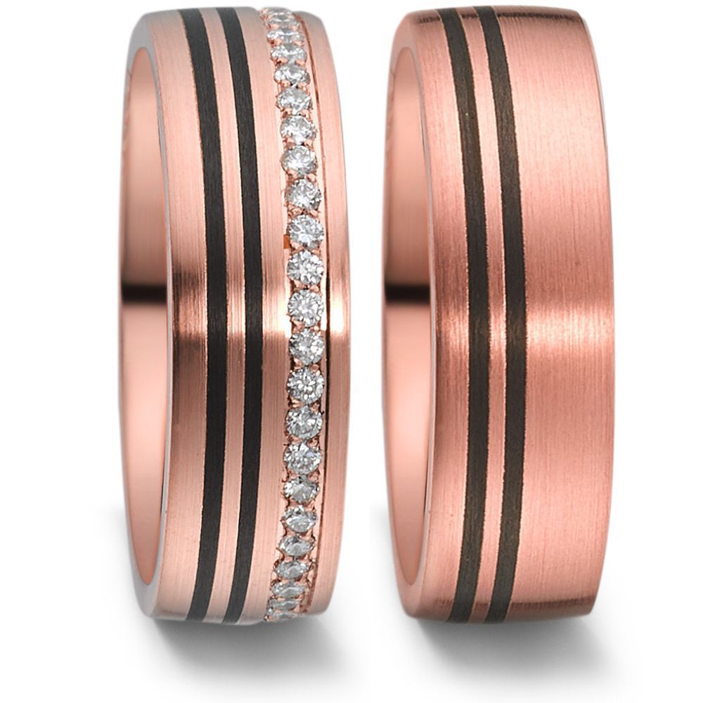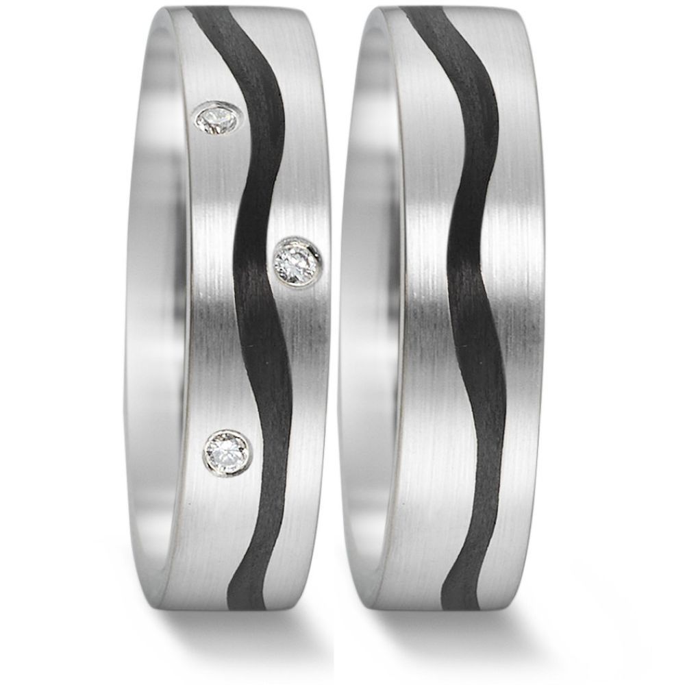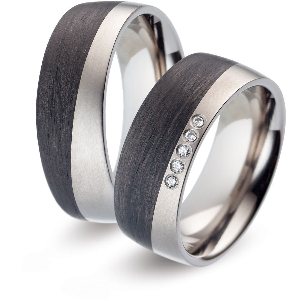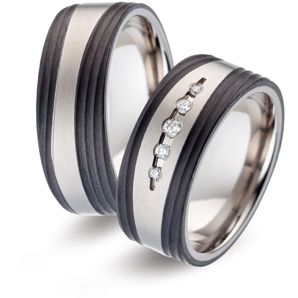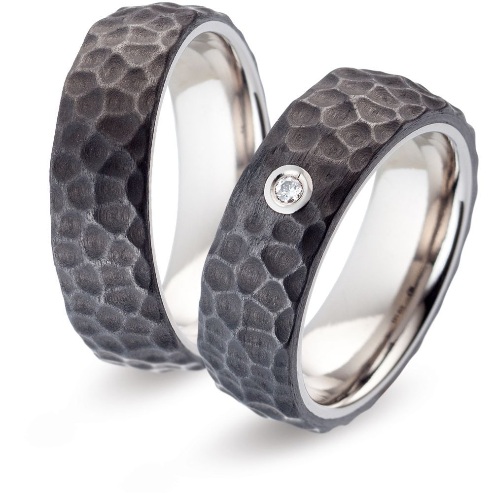 Carbon als Hightechwerkstoff begeistert durch seine absolute Stabilität und Beständigkeit gegen Chemikalien und Temperaturschwankungen. Zusätzlich gibt es beim Tragen kaum Abnutzungserscheinungen und die mit Carbon gefertigten Trauringe sind je nach Modell leichter als Ringe, die komplett aus einem Edelmetall gefertigt sind. Kombiniert mit farblich abgestimmten Legierungen wie Roségold, Rotgold, Palladium oder Platin und wunderschön strahlenden Brillanten, bezaubern die Modelle die Paare, die besondere Trauringe möchten.