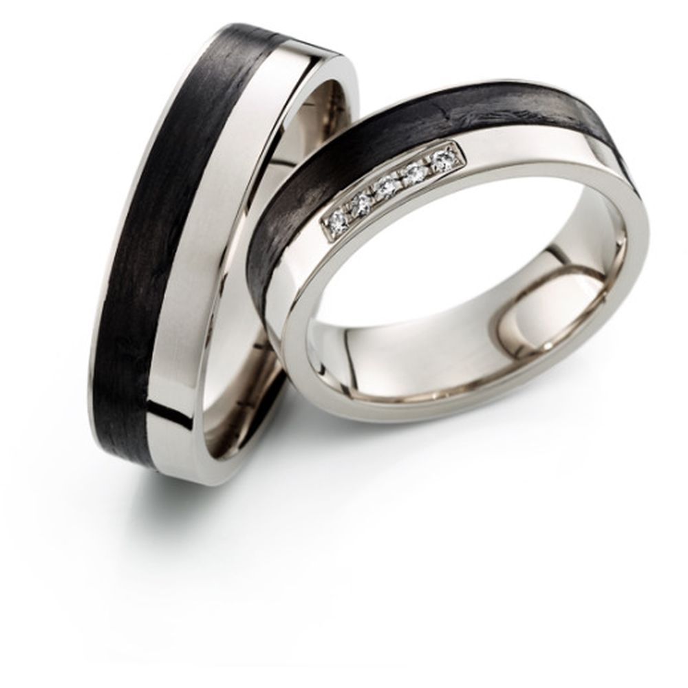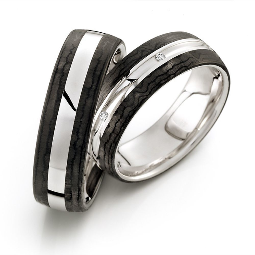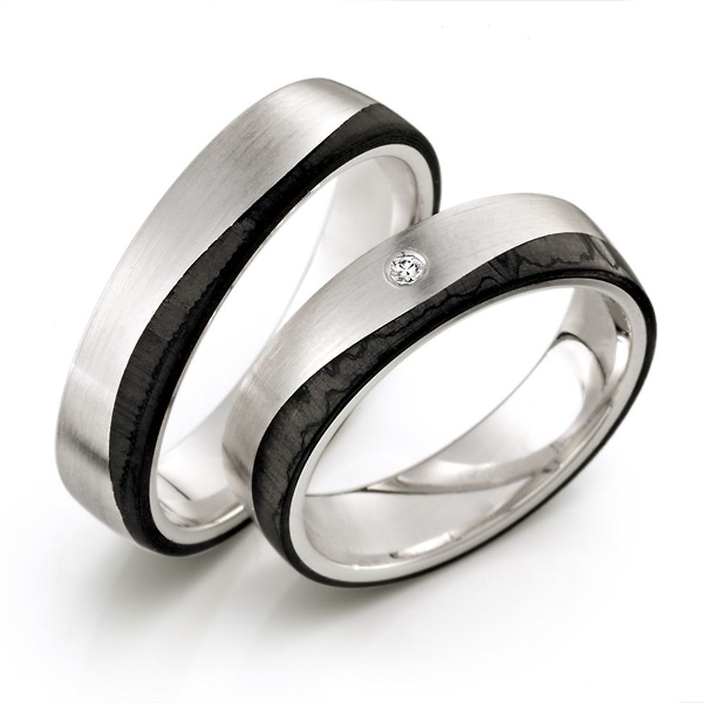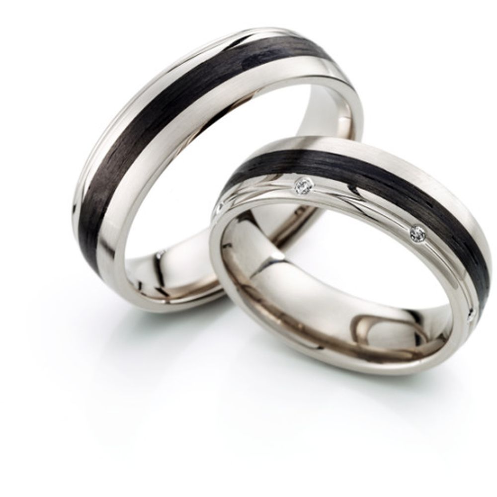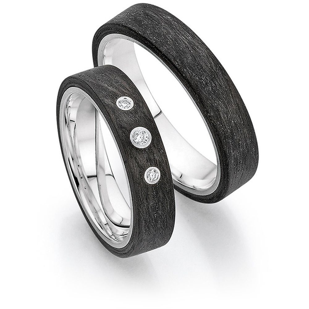Carbon als Hightechwerkstoff begeistert durch seine absolute Stabilität und Beständigkeit gegen Chemikalien und Temperaturschwankungen. Zusätzlich gibt es beim Tragen kaum Abnutzungserscheinungen und die mit Carbon gefertigten Trauringe sind je nach Modell leichter als Ringe, die komplett aus einem Edelmetall gefertigt sind. Kombiniert mit farblich abgestimmten Legierungen wie Roségold, Rotgold, Palladium oder Platin und wunderschön strahlenden Brillanten, bezaubern die Modelle die Paare, die besondere Trauringe möchten.