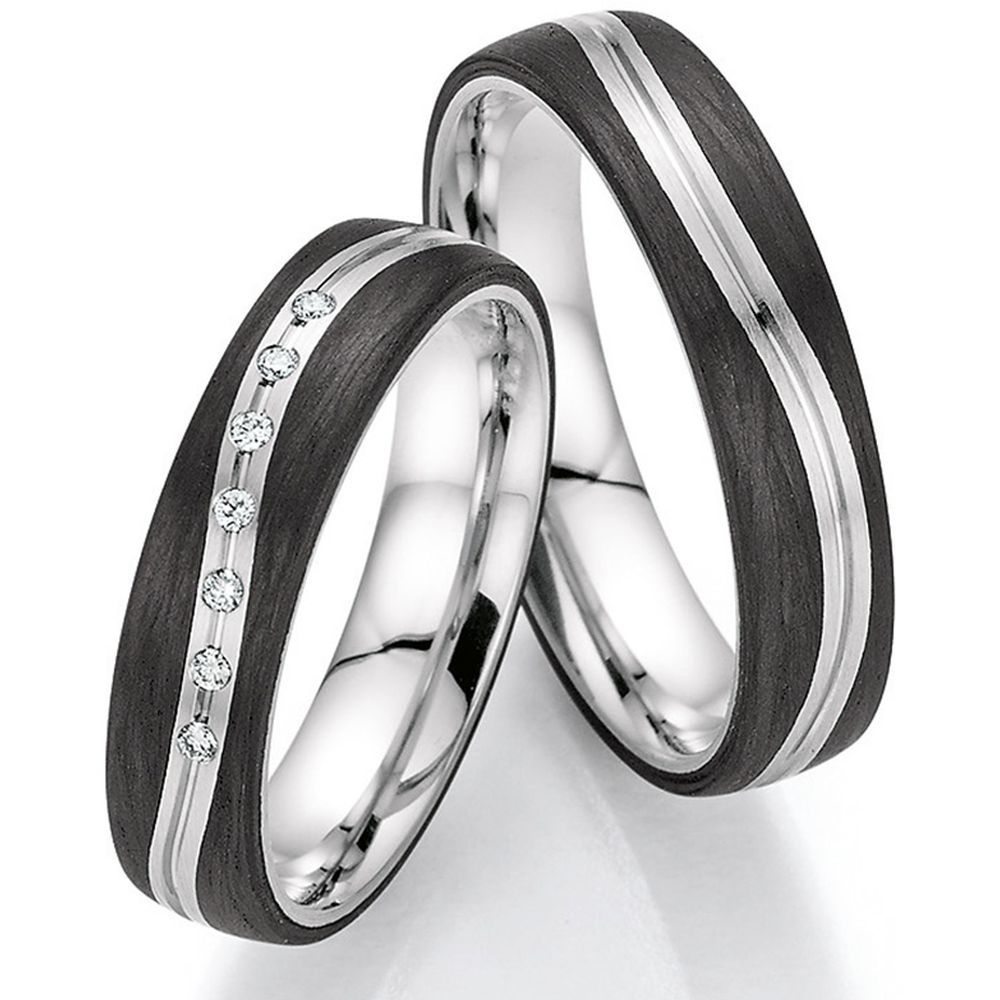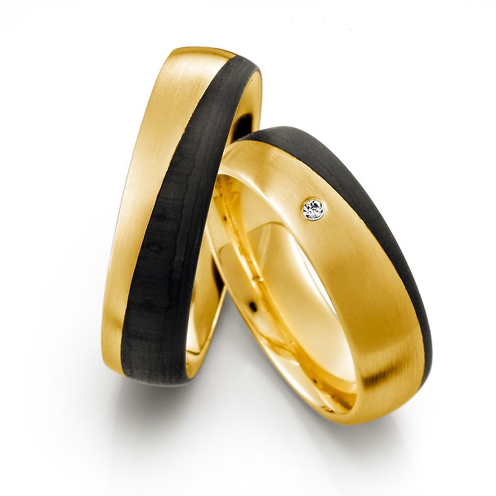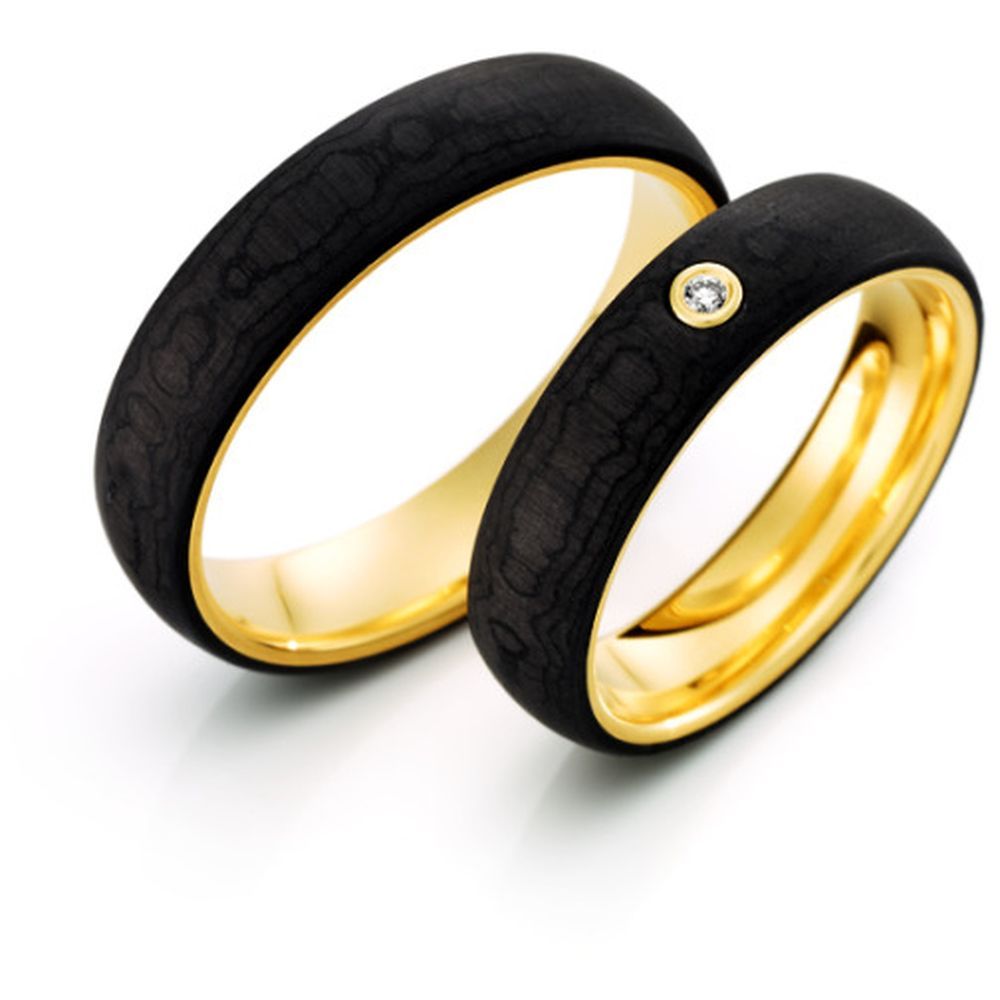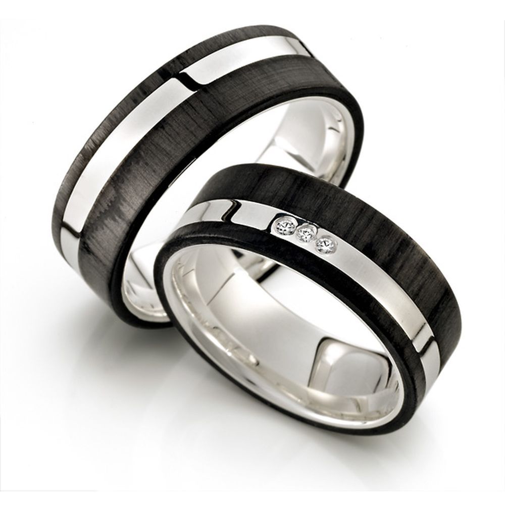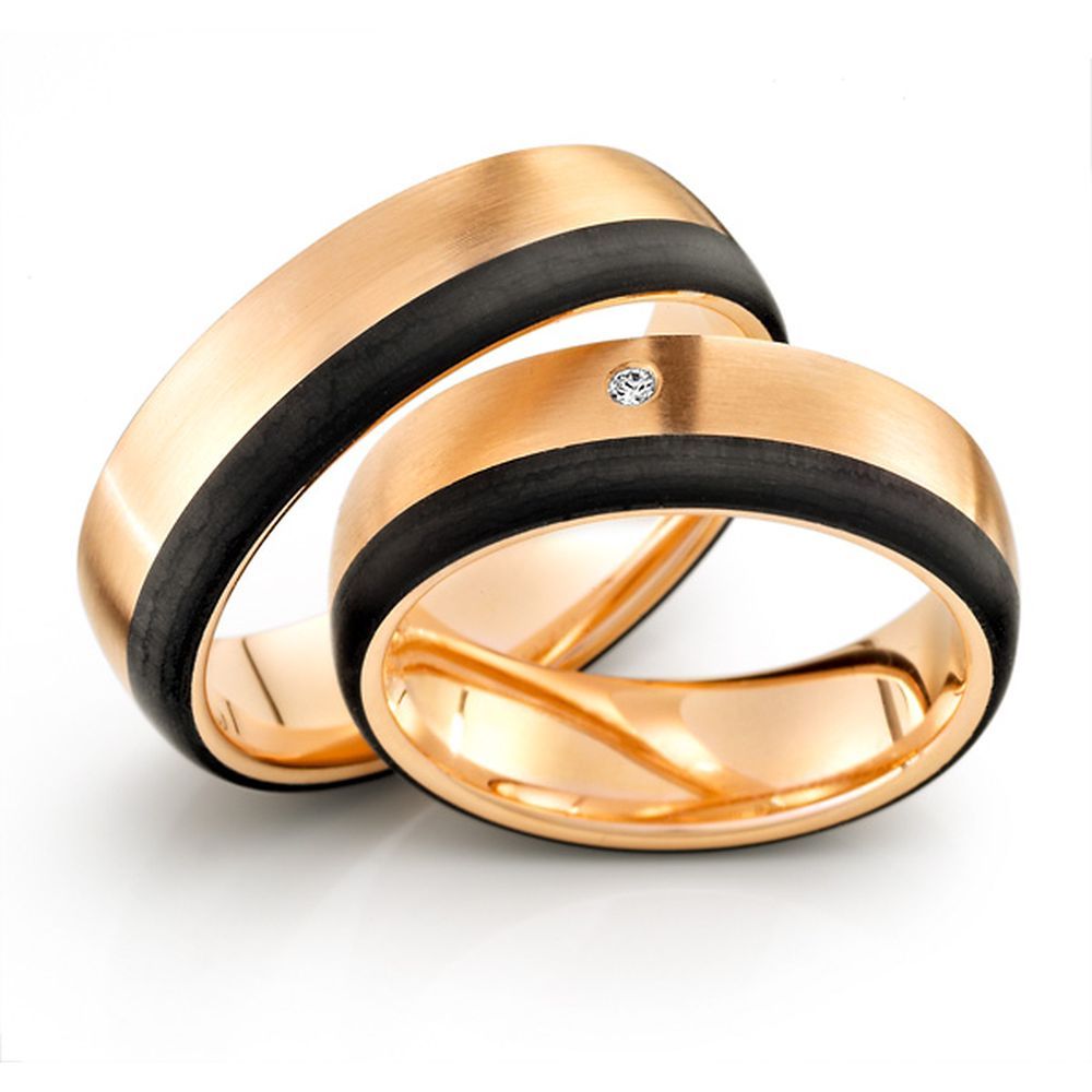 Carbon als Hightechwerkstoff begeistert durch seine absolute Stabilität und Beständigkeit gegen Chemikalien und Temperaturschwankungen. Zusätzlich gibt es beim Tragen kaum Abnutzungserscheinungen und die mit Carbon gefertigten Trauringe sind je nach Modell leichter als Ringe, die komplett aus einem Edelmetall gefertigt sind. Kombiniert mit farblich abgestimmten Legierungen wie Roségold, Rotgold, Palladium oder Platin und wunderschön strahlenden Brillanten, bezaubern die Modelle die Paare, die besondere Trauringe möchten.