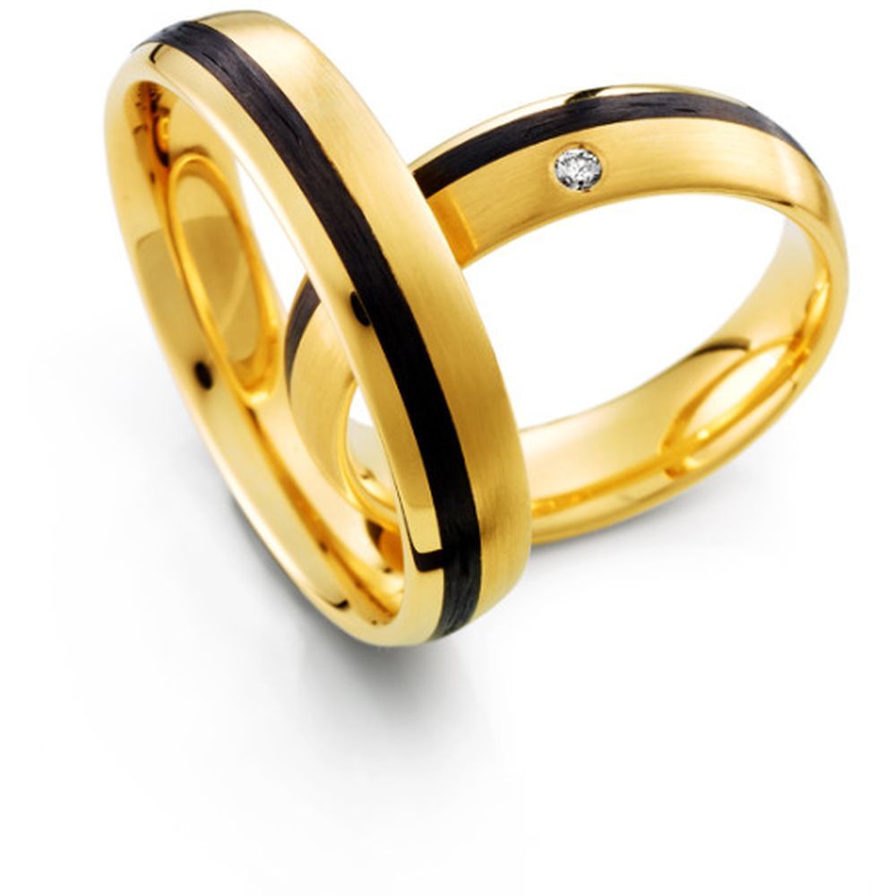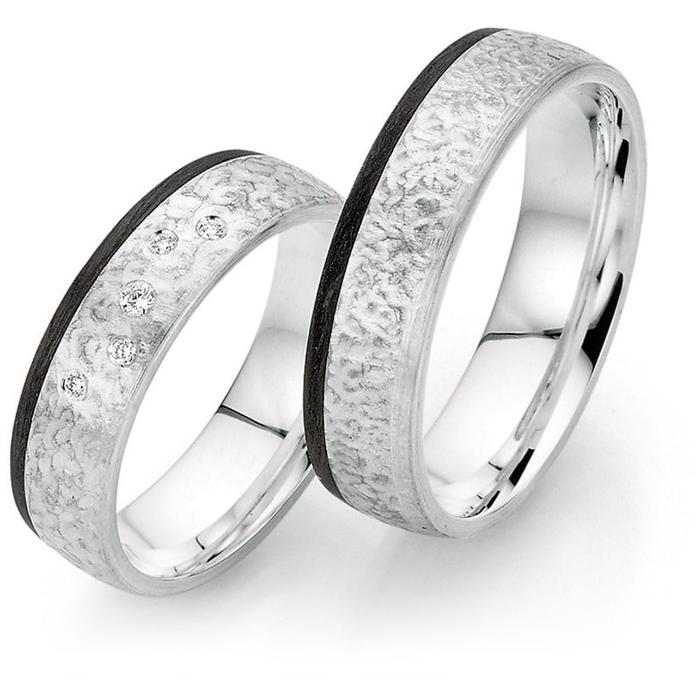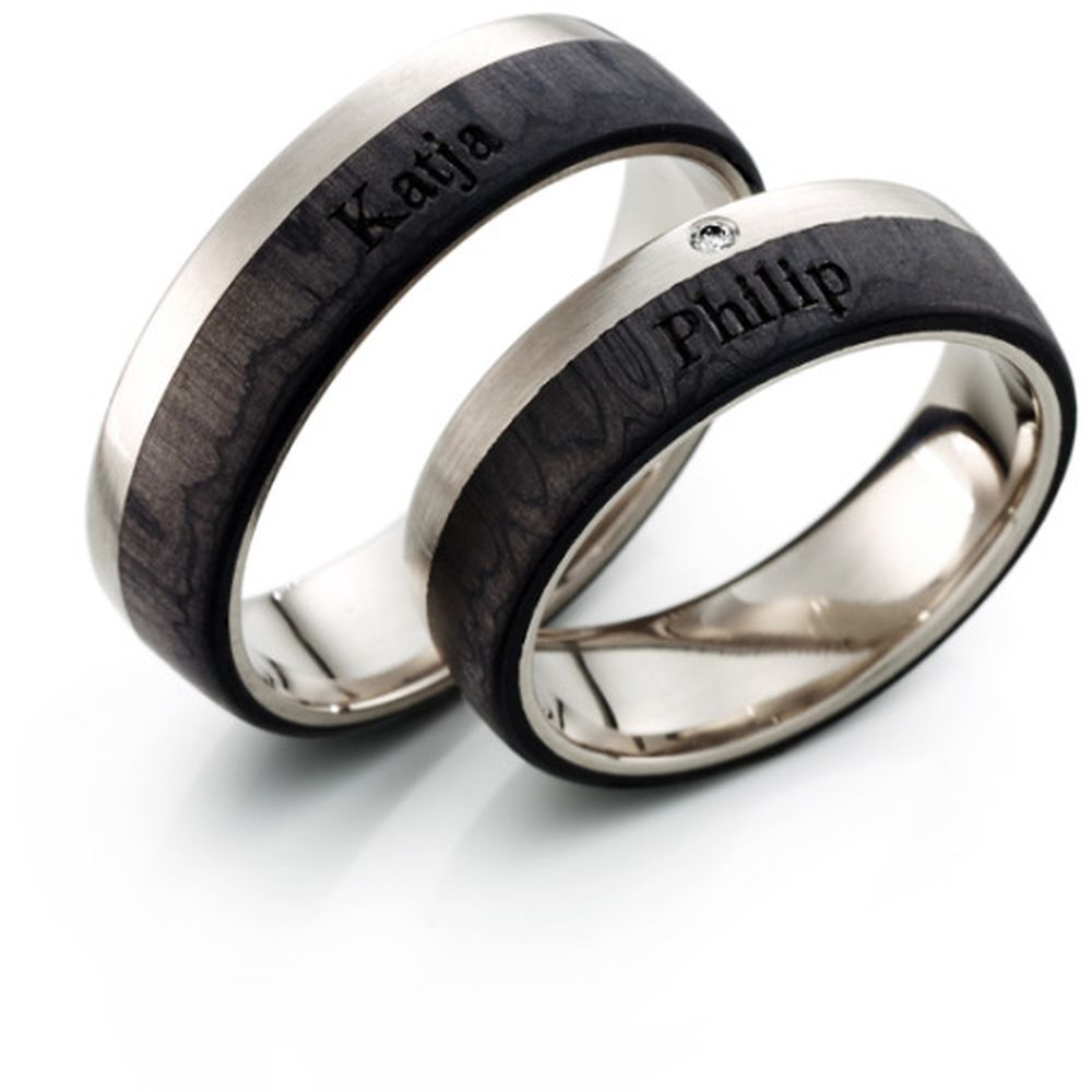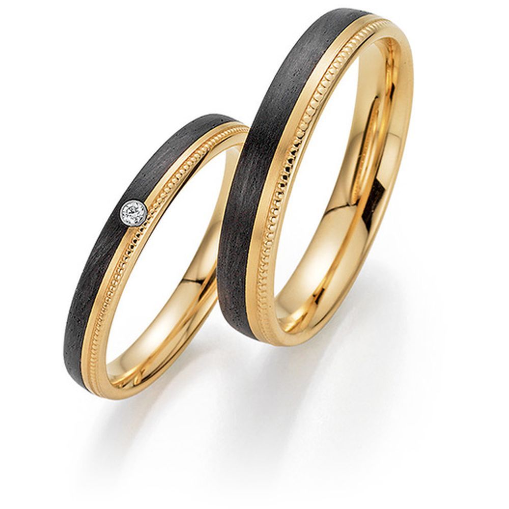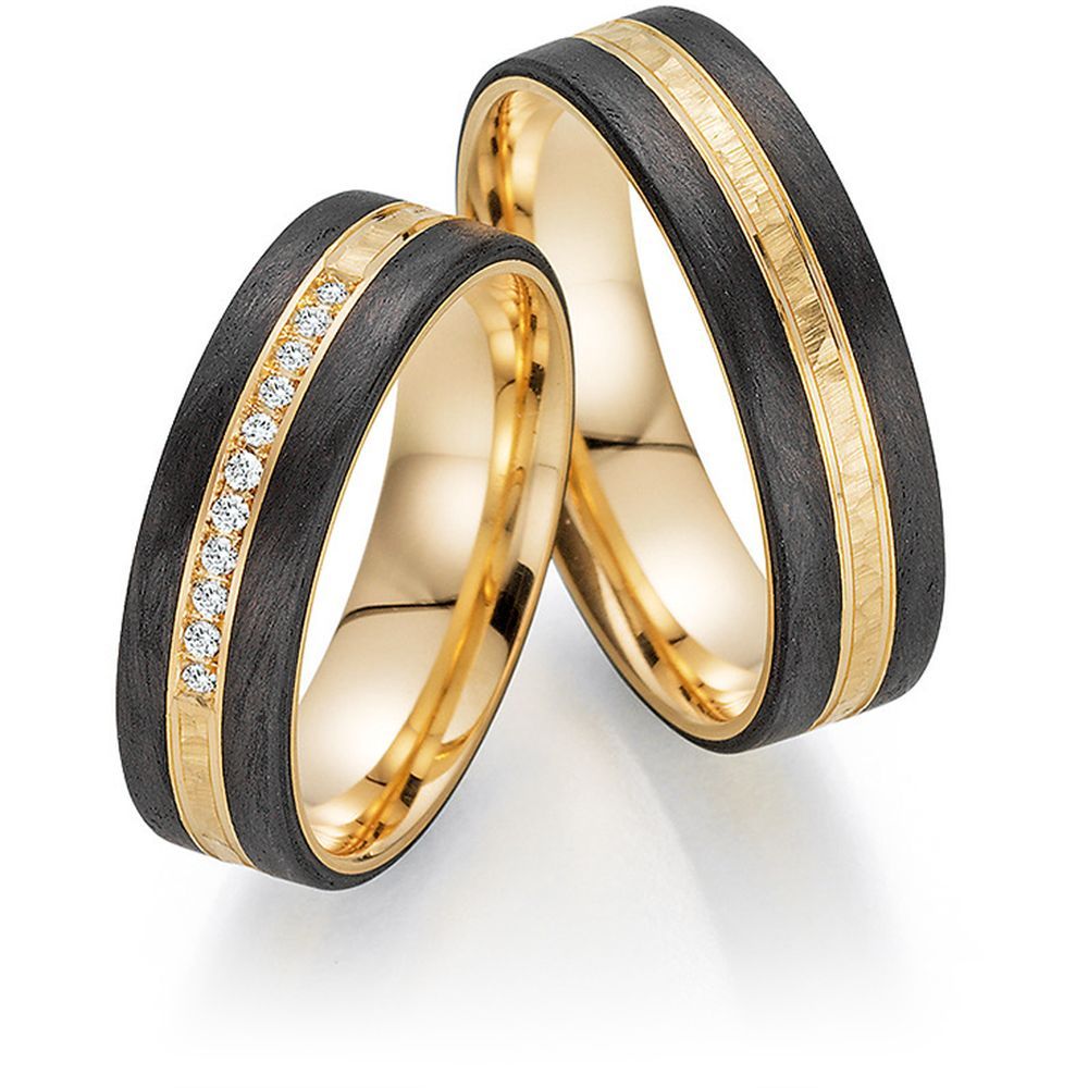 Carbon als Hightechwerkstoff begeistert durch seine absolute Stabilität und Beständigkeit gegen Chemikalien und Temperaturschwankungen. Zusätzlich gibt es beim Tragen kaum Abnutzungserscheinungen und die mit Carbon gefertigten Trauringe sind je nach Modell leichter als Ringe, die komplett aus einem Edelmetall gefertigt sind. Kombiniert mit farblich abgestimmten Legierungen wie Roségold, Rotgold, Palladium oder Platin und wunderschön strahlenden Brillanten, bezaubern die Modelle die Paare, die besondere Trauringe möchten.
