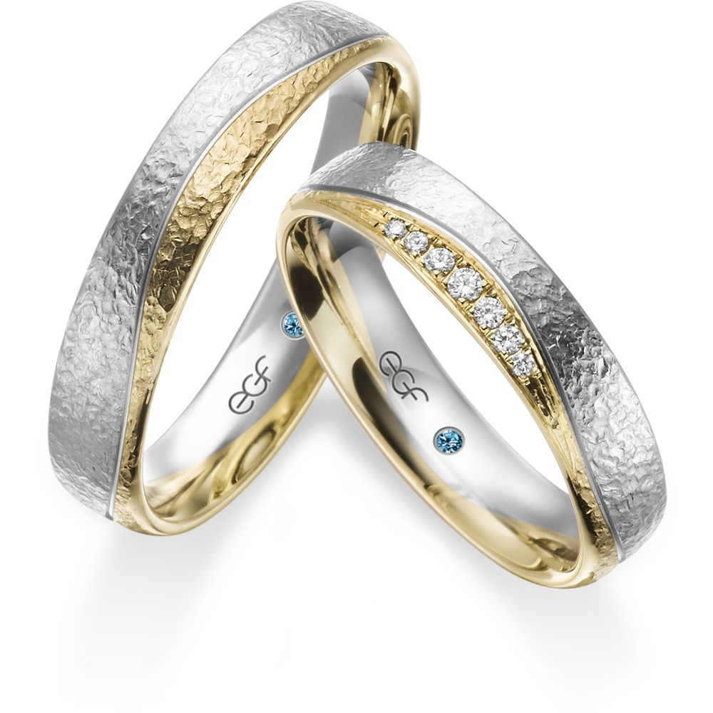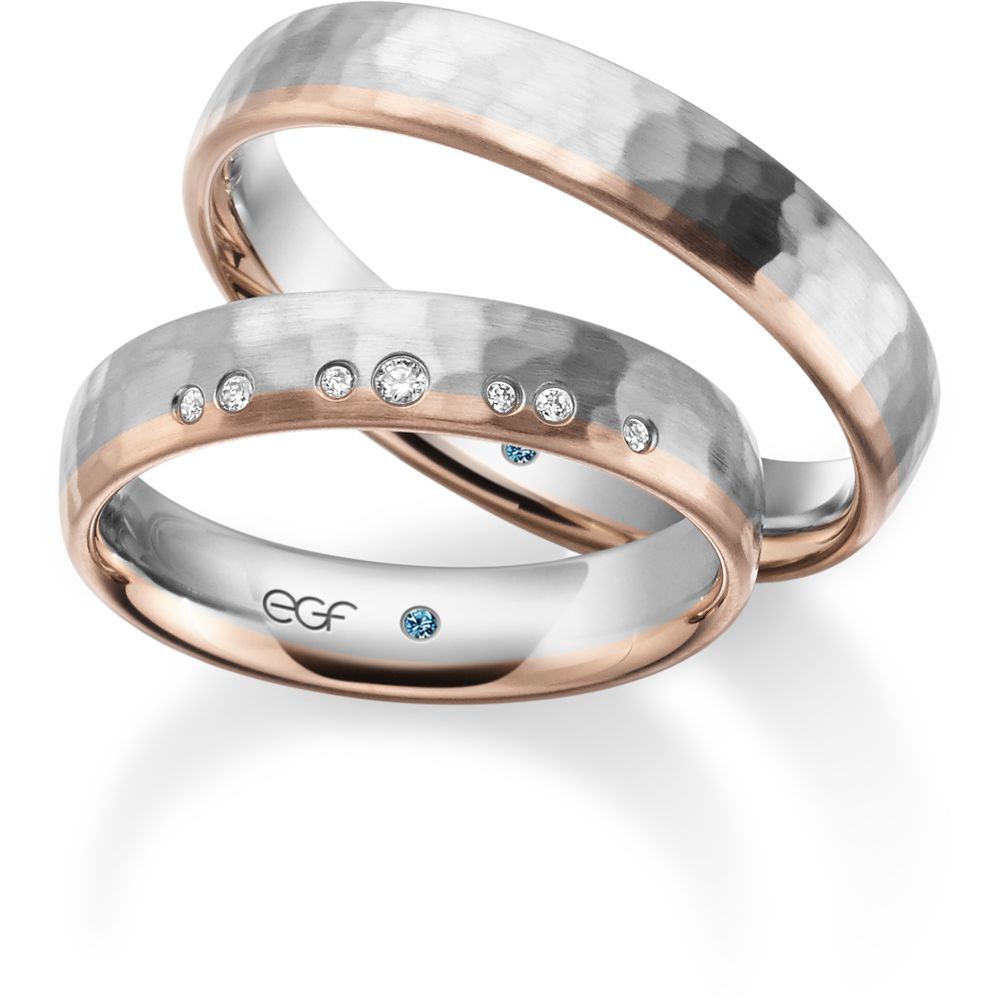 Kombinieren Sie verschiedene Materialien, in verschiedenen Farben, und kreieren Sie einen einzigartigen Trauring. Möglich ist alles was gefällt!
