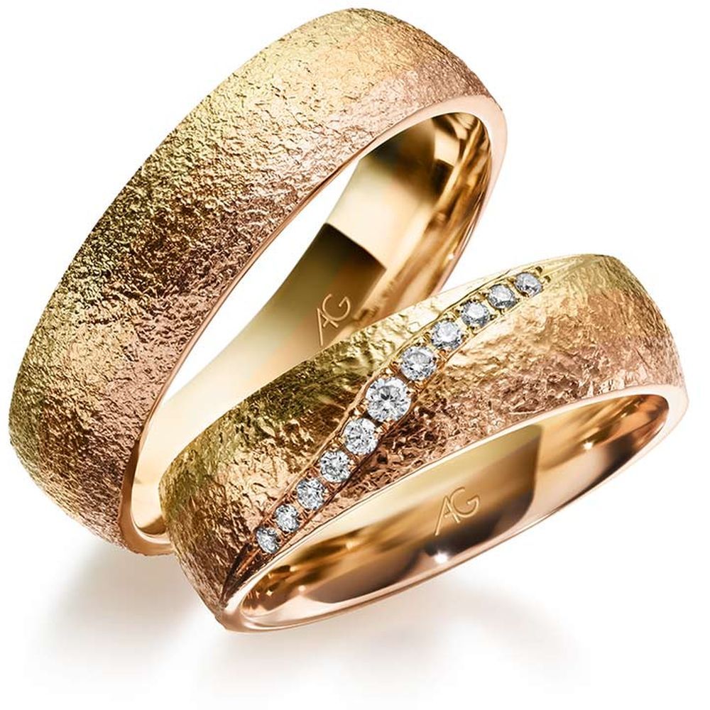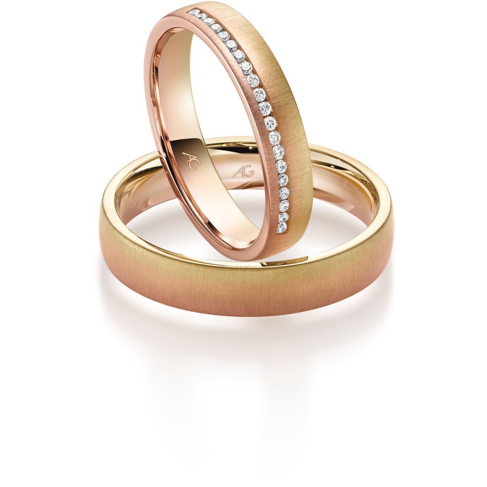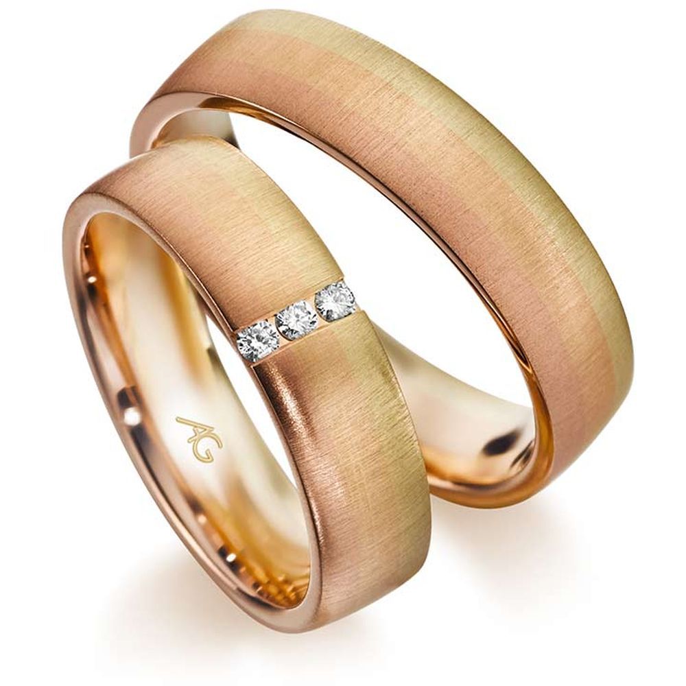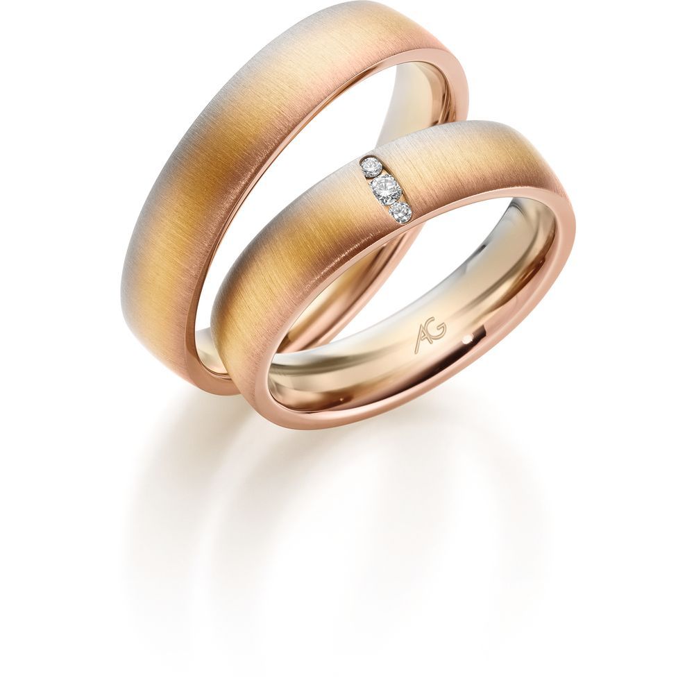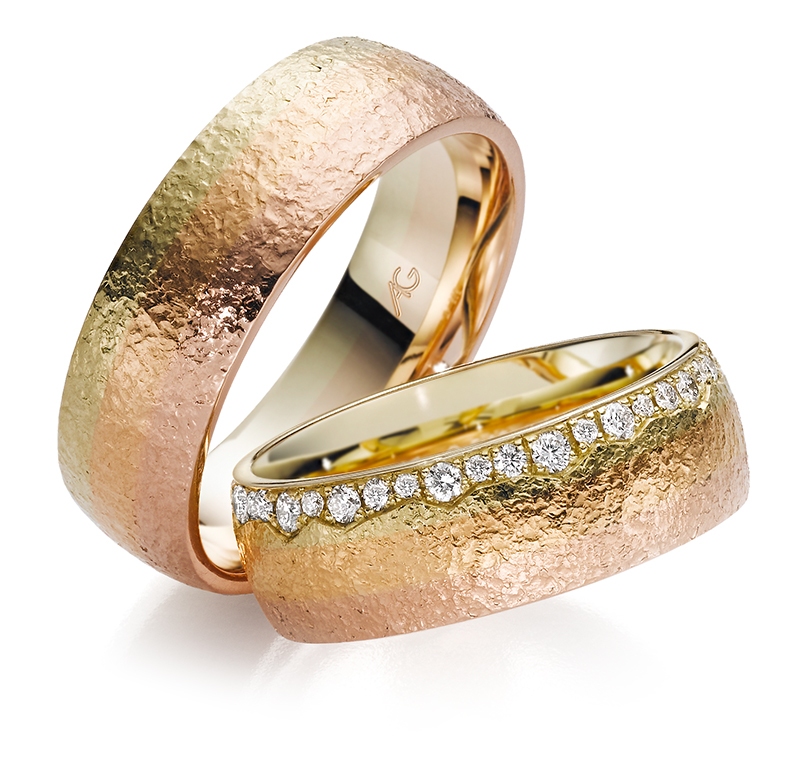 Morgenröte – der fließende Übergang von Gold in drei Facetten: Rotgold, Gelbgold und Roségold. Jeder Blick ergibt eine neue Farbschattierung. Je nach Betrachtungsrichtung wechseln die Ringe geheimnisvoll ihre Farben…