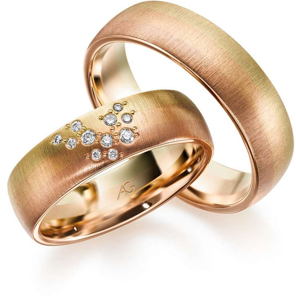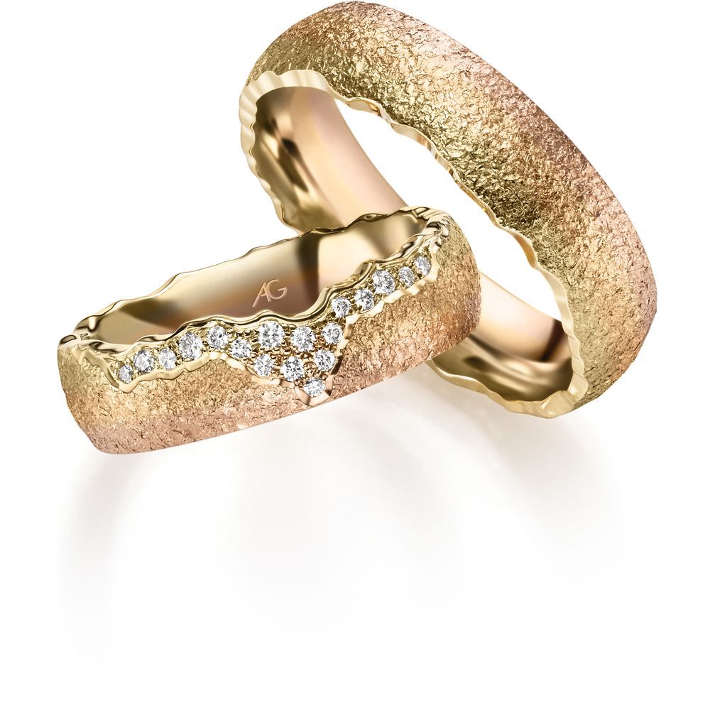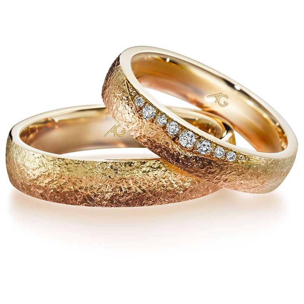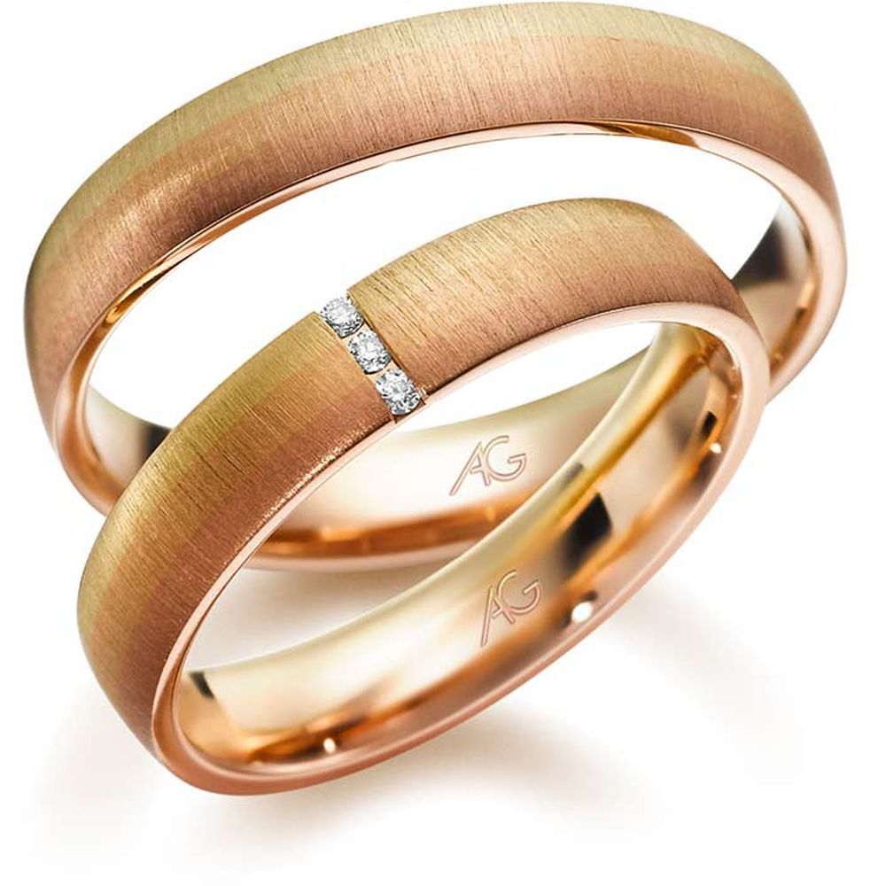 Morgenröte – der fließende Übergang von Gold in drei Facetten: Rotgold, Gelbgold und Roségold. Jeder Blick ergibt eine neue Farbschattierung. Je nach Betrachtungsrichtung wechseln die Ringe geheimnisvoll ihre Farben…