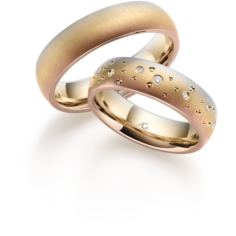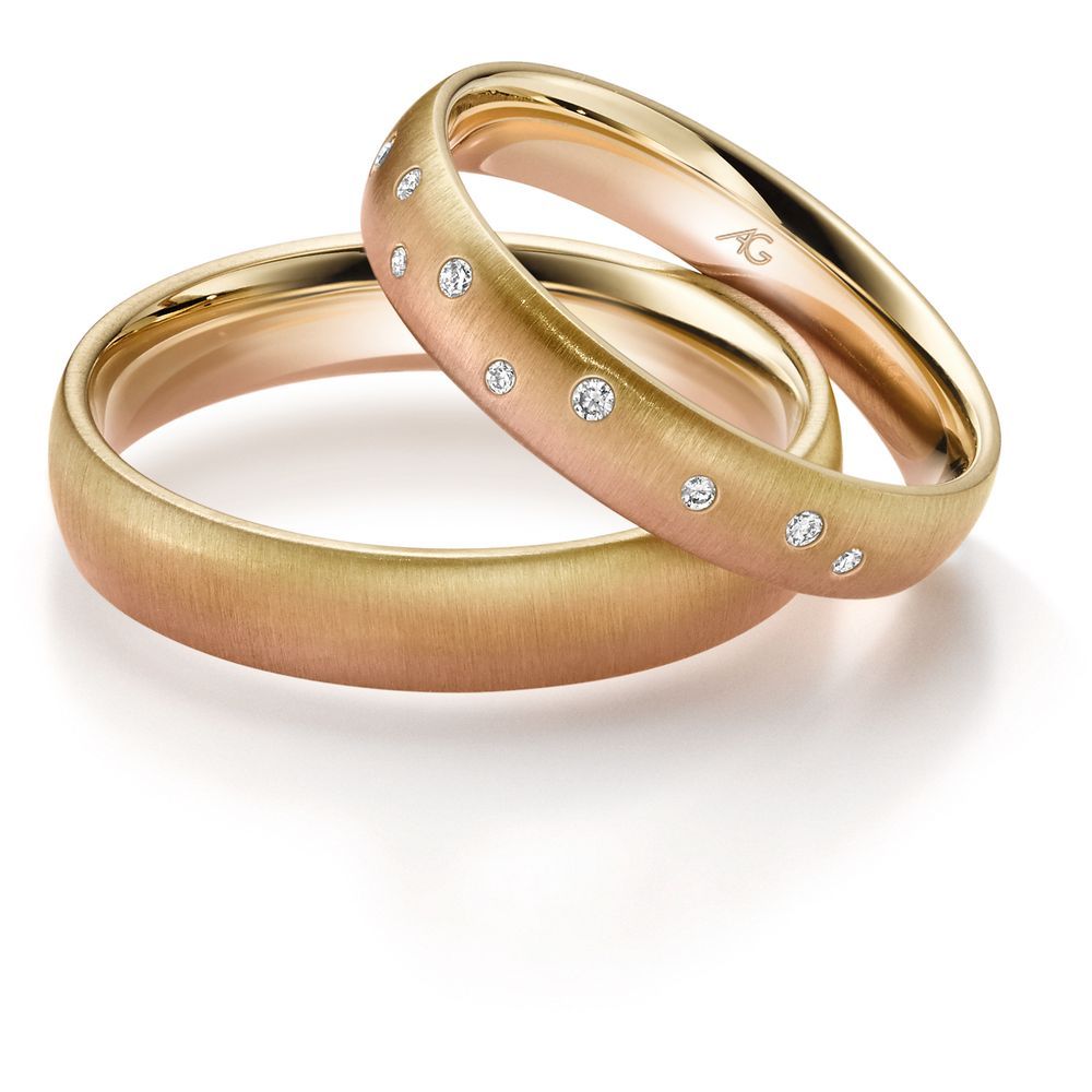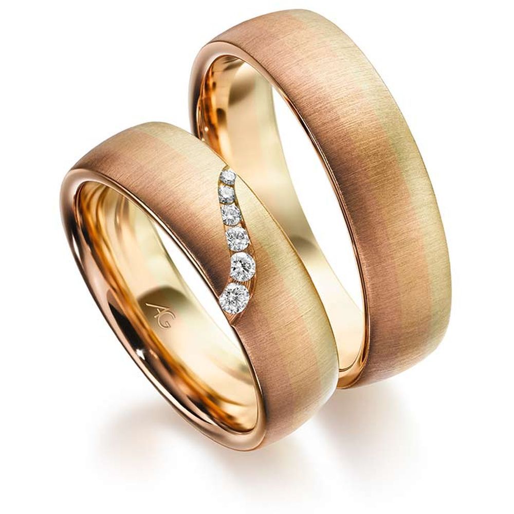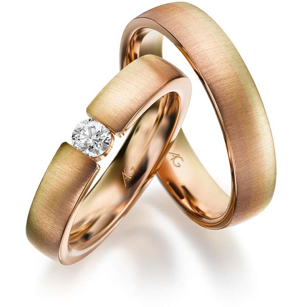Morgenröte – der fließende Übergang von Gold in drei Facetten: Rotgold, Gelbgold und Roségold. Jeder Blick ergibt eine neue Farbschattierung. Je nach Betrachtungsrichtung wechseln die Ringe geheimnisvoll ihre Farben…